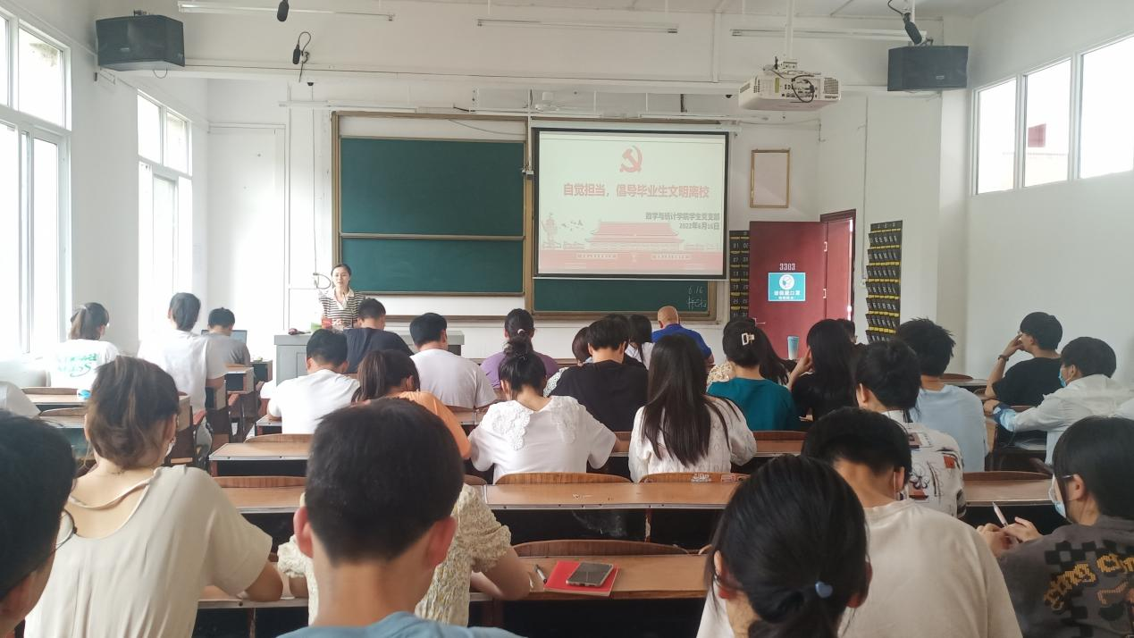 为了更好地完成毕业生文明离校教育这一项重要工作,2022年6月16日,我院学生党支部在数学与统计学院3303教室召开党员大会,开展“自觉担当,倡导毕业生自觉离校”为主题的支部主题党日活动。会议由支部书记黄丽娜同志主持。