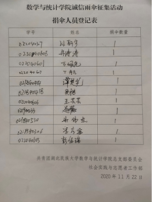 本网讯(见习记者 王瑶 杨娇 杨灿/文 李诚 孙梦/摄)为我校广大师生下雨天出行提供方便,贯彻我院“急人之所急,予人之所需”的优良作风。11月22日,我院团总支社会实践与志愿者工作部在大学生广场开展以“征集爱心伞,雨中送真情”为主题的诚信雨伞征集活动。