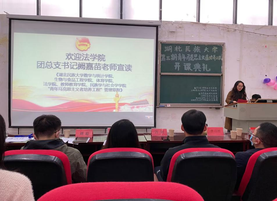 本网讯(记者 唐金凤 余欣华/文 余欣华/摄)11月17日下午,我院联合生物与食品工程学院、法学院、教师教育学院、民族学与社会学学院,体育学院在修远楼5B404教室共同举办第三期青年马克思主义培养工程培训开课典礼。民族学与社会学学院总支书记曹召胜老师,体育学院总支副书记万利老师,数学与统计学院总支书记刘聪老师,生物与食品工程学院团总支书记张鑫媛老师,法学院团总支书记阙嘉苗老师,民族学与社会学学院团总支书记冷红豆老师,教师教育学院党总支副书记田蜜老师出席本次活动,六院“青马工程”学员共同到场参与。