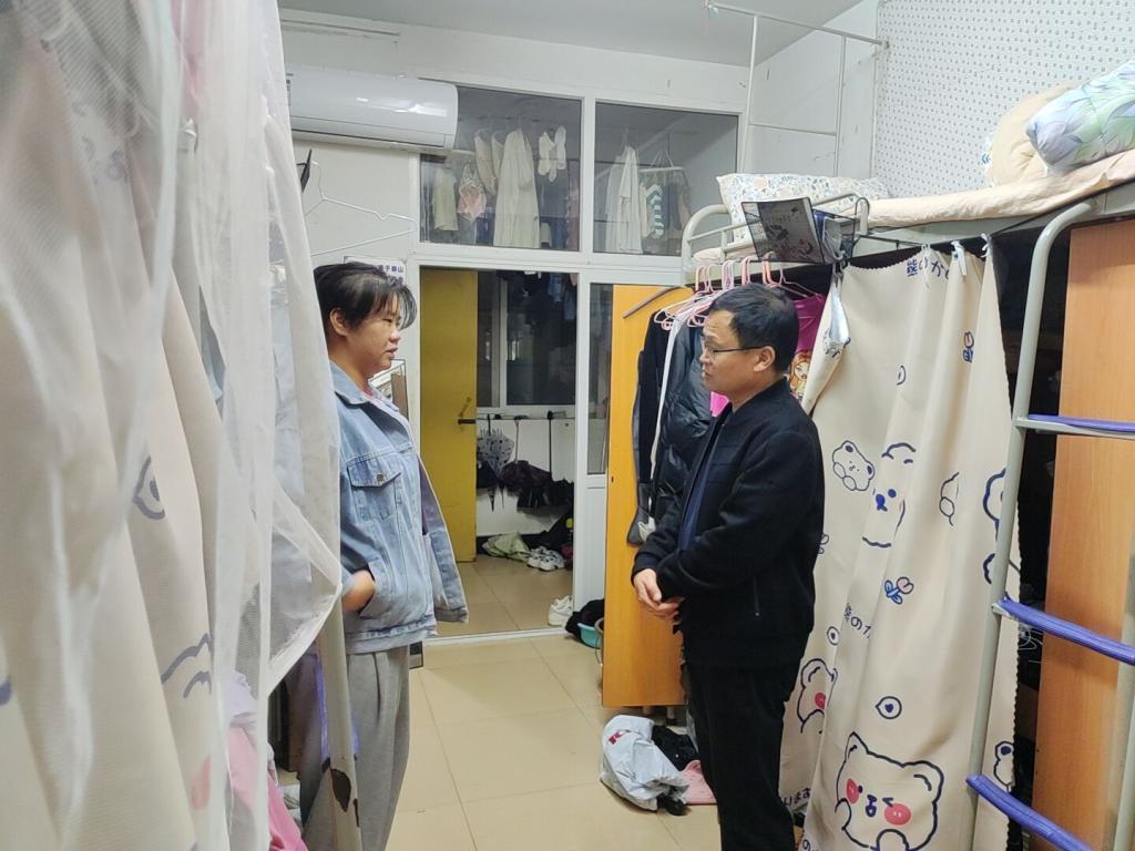 在排查过程中,赵书记提醒同学们要及时排查和整改各类安全隐患,落实安全措施。同时,他强调要不断提高寝室环境卫生意识的重要性,并鼓励大家养成良好的卫生习惯,共同营造温馨舒适的寝室氛围。除此之外,赵书记还详细询问同学们的生活近况和需求,并一一解答同学们在生活、学习以及未来职业规划发展道路方面的困惑。为此,赵书记还对同学们的学习规划与未来发展方向提出了殷切希冀和宝贵建议。