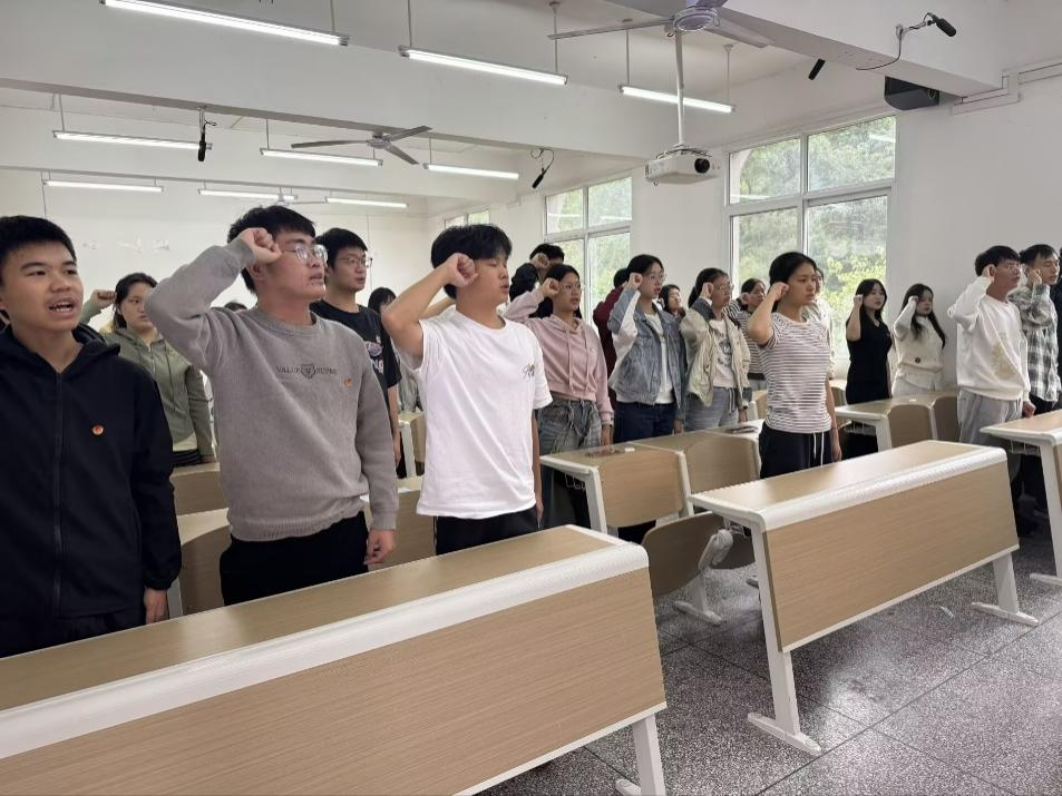 活动在嘹亮的团歌声中拉开序幕,全体团员面向团旗庄严宣誓,重温入团誓词,进一步增强了新时代青年的荣誉感与使命感。随后,余聪围围绕理想信念、青春奋斗、使命担当等方面深入解读主题内涵,号召同学们以“请党放心、强国有我”的誓言为引领,在科研创新、乡村振兴和基层服务中绽放青春光彩。