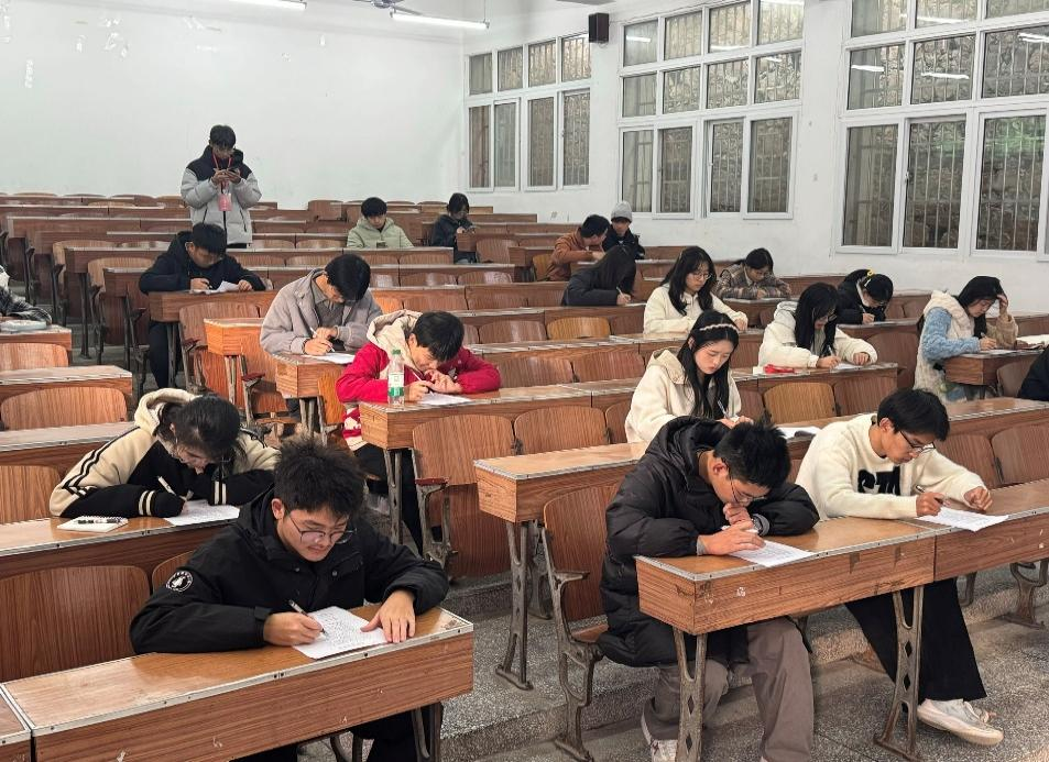 本次竞赛创新采用“知识答题+策略博弈”双阶段模式。第一阶段为笔试环节,参赛者在3307教室限时完成数学与建模知识试题,答题正确数直接转换为“棋子”数量,作为晋级依据。考场内同学们凝神静思、认真作答,展现出扎实的知识储备与严谨的思维。