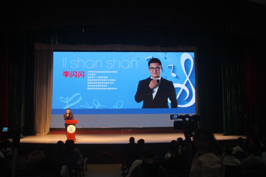 本网讯(记者 杨颖)11月14日,音乐舞蹈学院首届创新创业节校友创业讲座在音乐舞蹈学院演播厅举行。湖北省音乐家协会会员、恩施市音乐家协会副主席兼秘书长、恩施州海艺琴行有限公司董事长、恩施市海艺音乐培训学校校长李闪闪,湖北省优秀支教教师、鹤峰县思源实验学校教师周洲担任主讲嘉宾,我院副院长焦娜主持。