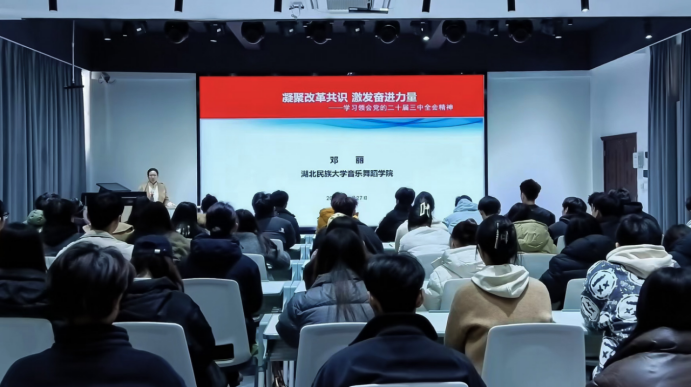 11月29日,音乐舞蹈学院党总支副书记邓丽同志,在学院演播厅为音乐舞蹈学院入党积极分子、团学干部代表以“凝聚改革共识 激发奋进力量——学习领会党的二十届三中全会精神”为题,讲了一堂生动的主题党课。课上邓书记给同学们梳理了党的二十届三中全会召开的概况,组织同学们重点学习了《中共中央关于进一步全面深化改革 推进中国式现代化的决定》(进一步全面深化改革的重大意义和总体要求);结合结合新时代大学生成长成才重点阐述了作为新时代大学生如何正确认识支持党中央的决策部署,以及作为新时代大学生如何将个人成长融入国家发展等问题。现场的同学们哥哥聚精会神,收获满满。