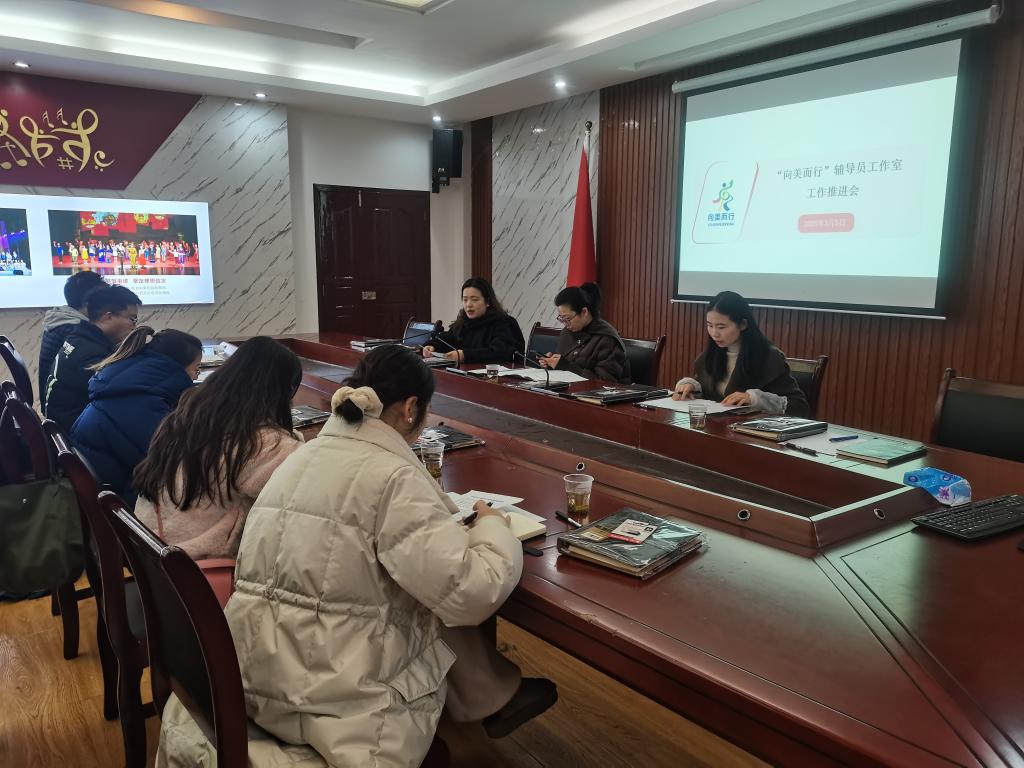 2025年3月5日,“向美而行”辅导员工作室2025年工作推进会在音乐舞蹈学院会议室顺利召开,来自文学与传媒学院、经济与管理学院、智能科学与工程学院、外国语学院、美术与设计学院、音乐舞蹈学院的10名成员参会,工作室负责人胡自爱主持会议。