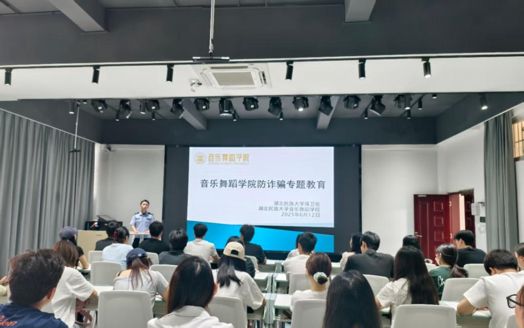 6月12日,音乐舞蹈学院联合学校保卫处在学院智慧教室开展2025年春季学期防诈骗专题教育活动,恩施市舞阳派出所民警唐凡担任主讲人,音乐舞蹈学院学生组织全体学生干部聆听讲座。