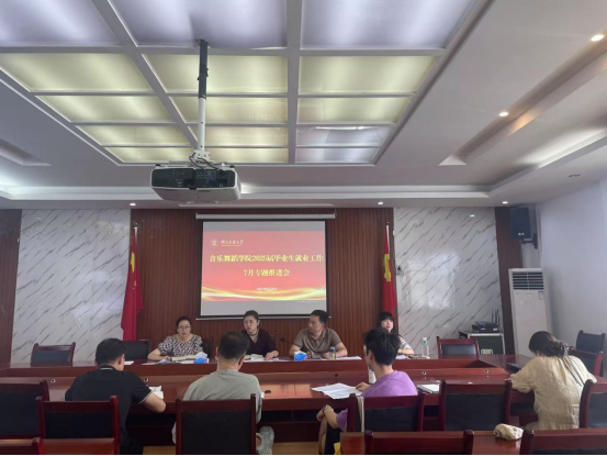 6月30日,音乐舞蹈学院2025届毕业生就业工作7月专题推进会在学院四楼会议室召开,学院党总支书记张蕊、院长谷秋阳、副院长焦娜、党总支副书记邓丽,学生科科长胡自爱、毕业班班主任、航艺专业企业方负责就业教师参加会议。会议由党总支副书记邓丽主持。