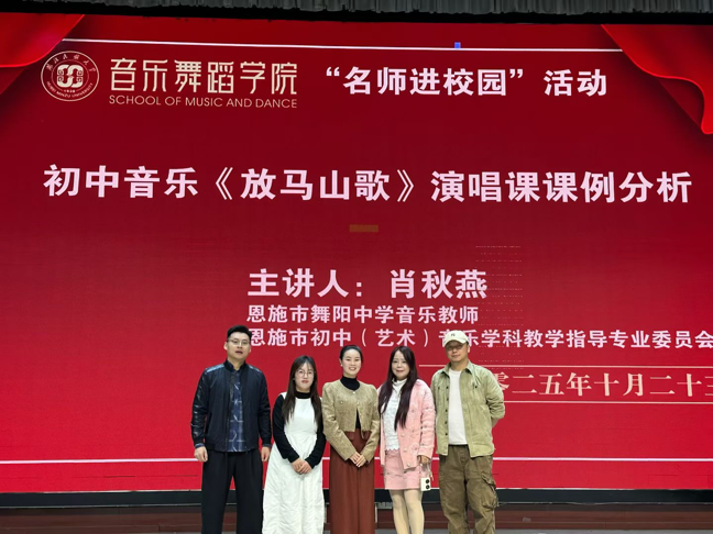 2025年10月23日,恩施市初中音乐学科教学指导委员会委员、舞阳中学音乐学科组长肖秋燕回到母校,在365电子娱乐官方网站音乐舞蹈学院演播厅举办《放马山歌》课例分析专题讲座,为师生展示了一堂生动的民歌教学示范课。