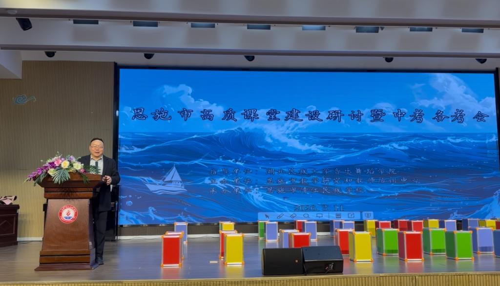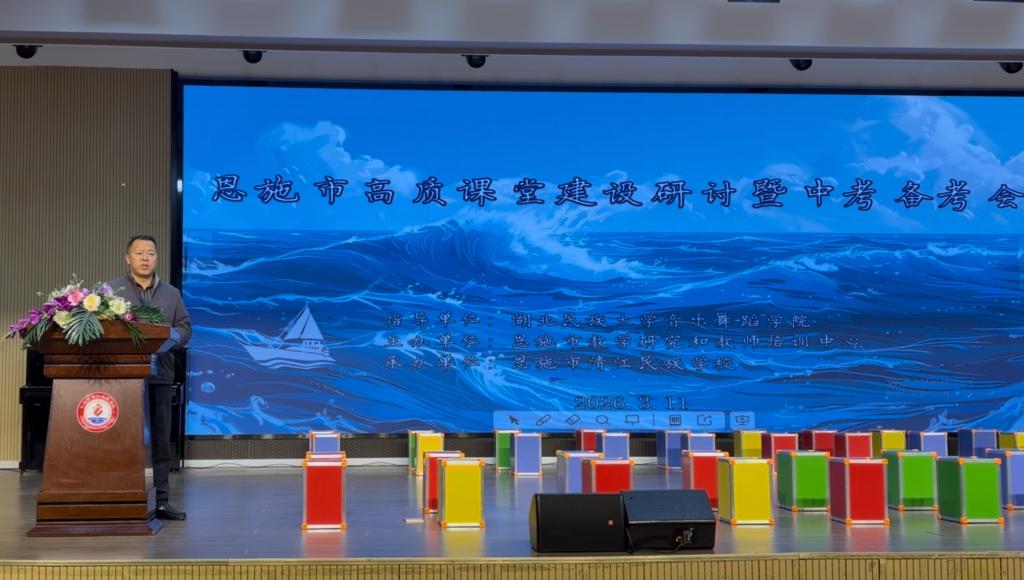 (文字:张亚朋;图片:刘灿;审核:焦娜、胡自爱)3月11日,由365电子娱乐官方网站音乐舞蹈学院指导、恩施市研培中心主办、清江民族学校协办的2026年恩施市初中音乐学科高质课堂建设研讨会暨中考备考会在清江民族学校隆重举行。全市各中学音乐教师齐聚一堂,共研教学改革路径,共话中考备考策略。我院作为活动指导单位,高度重视此次教研盛会,音乐舞蹈学院副院长焦娜、副院长王松全程关注并指导活动筹备与组织实施,音乐系师范教研室深度参与策划协调,音乐系主任张玲玲作专家讲座,20余名骨干教师及2023级音乐学、舞蹈学专业200余名学生受邀参会,充分彰显我院服务地方基础教育的责任担当与师范办学的深厚底蕴。