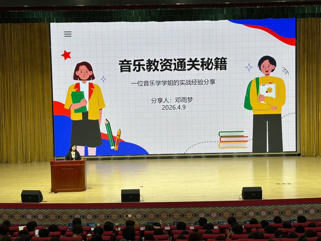 为进一步提升我院教师资格证通过率,助力师范类专业认证工作,切实提高师范教育整体质量,4月9日下午14:00,音乐舞蹈学院在新区多功能厅隆重举行2026年教师资格证学习分享大会。音乐舞蹈学院院长谷秋阳、副院长焦娜,教师教育学院教师教育课程部负责人黄鸿,学院各科室负责人、系主任、教研室主任,2023级、2024级、2025级音乐学和舞蹈学班主任及全体学生参会。活动由副院长焦娜主持。