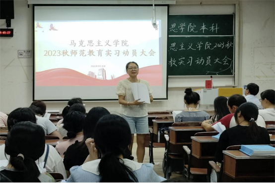 教育实习是师范生培养的重要组成部分,为确保2020级教育实习工作的顺利开展,9月10日18:00,我院在德智楼9B108教室举行2023年秋师范教育实习动员大会。我院院长徐铜柱,思想政治教育系主任邱世兵受邀出席。我院全体2020级学生参与此次活动。本次活动由教学科科长兰洁主持。