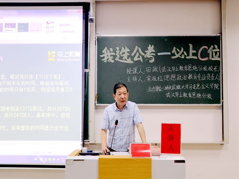 本网讯(通讯员 谭绍杰 李小曼/文 吴谦忠/图)71日晚,我院在德智楼9B210教室举办以我选公考 必上C为主题的公务员知识讲座。武汉毕上教育恩施分校校长田政应邀并担任主讲人。我院思想政治教育系负责人宋祖红以及大二、大三全体学生参加此次活动。