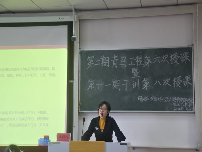 本网讯 (通讯员王婵媛 见习通讯员 赵光荣  王祝凯/文 向爱萍 赵兴玥/图)11月26日下午,我院于德智楼9B210教室举行以“百年党史看中国共产党的凝聚力”为主题的第二期青马工程第六次授课暨第十一期干训第八次授课。我院教师蔡诗敏受邀出席并担任主讲人。我院第二期青马工程全体学员以及大一全体学生干部参加此次活动。