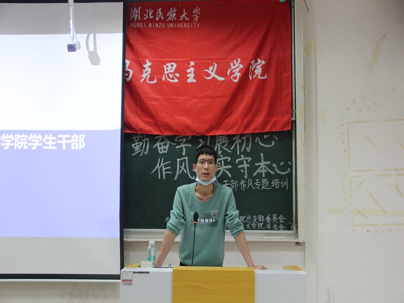 本网讯(见习通讯员 成楠 胡晓丽/文 孙航/图)4月12日下午,我院于德智楼9B108教室开展以“勤奋学习展初心,作风务实守本心”为主题的学生干部素质专题培训。特邀团总支书记毛召担任主讲人,我院大一全体学生干部参与此次活动。