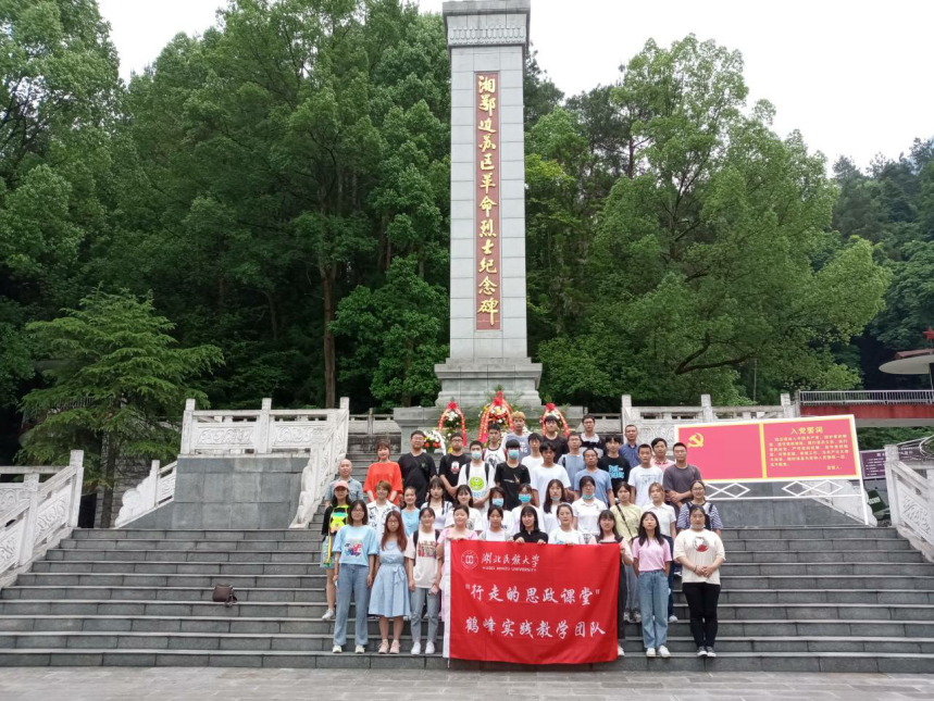 鹤峰队由教师万俊、冯显德、袁大勇带领,前往集优农产品展示中心和湘鄂边苏区鹤峰革命烈士陵园进行参观。在场学生聆听了由鹤峰县委宣传部理论宣教股股长黄珊珊带来关于当地“茶文化”的精彩讲解。随后,带队老师和学生来到革命烈士纪念碑前向革命烈士鞠躬默哀。在场学生认真聆听了解有关革命历史及英雄故事纷纷表示要以革命先烈为榜样,传承优秀革命文化,精进学业,投身到中国特色社会主义的伟大实践当中。
