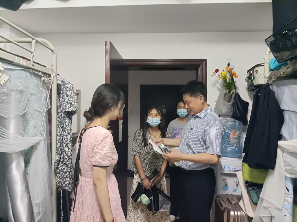 学院领导和老师共分为两队,由罗成富、徐铜柱带队,分别去到学生宿舍,围绕近期学习生活情况、本科生导师制、未来规划、学生活动、暑期社会实践、就业方向、论文开题等与我院学生进行了交流沟通,不仅仔细解答了学生提出的相关问题,还对学生反映的情况进行了详细记载。在毕业生寝室,罗成富叮嘱即将就业的学生要在新的岗位上继续努力,踏实工作,展现出马院学子良好的精神风采;鼓励暂未就业的同学要根据自身实际情况,及时调整心态和期望值,转变就业观念,先就业后择业。在大二学生宿舍,徐铜柱关心学生的生活环境问题,叮嘱学生要合理使用空调,节约用电,在疫情防控常态化的背景下要保持通风,养成良好的生活习惯。同时,他勉励学生要志存高远,珍惜时光,努力上进,成就不悔人生。