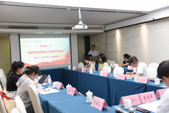 平行论坛一围绕“习近平文化思想与文化强国建设”议题展开,共有12篇论文汇报。由华中农业大学马克思主义学院院长、教授梁伟军主持,山东师范大学教授贾英健担任评议人。专家学者围绕“习近平文化思想与新时代文化建设”这一主题展开了充分交流研讨,包含对坚定文化自信的理论意涵与实践路径、建设中华民族现代文明的哲学释义、习近平文化思想的相关内容的分享,具有很强的学理性、思想性、指导性。