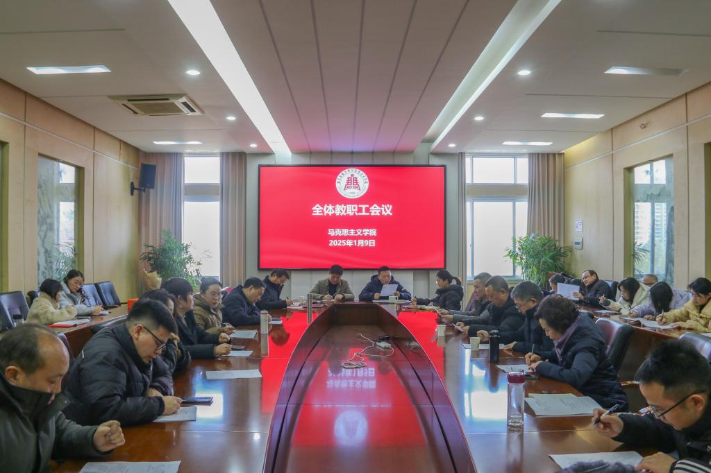 随后,在全院教职工会议上,向驰首先传达学校2025年寒假放假及春季学期开学有关工作通知,他鼓励大家充分利用假期,开展科研与教学准备工作,不断提升自我,做最好的自己。同时,他高度评价了学院近期举办的表彰大会暨元旦晚会,并表示学院将积极营造干事创业的良好氛围,激发全体师生的创造活力,让每一位马院师生都有强烈的归属感、获得感和幸福感。