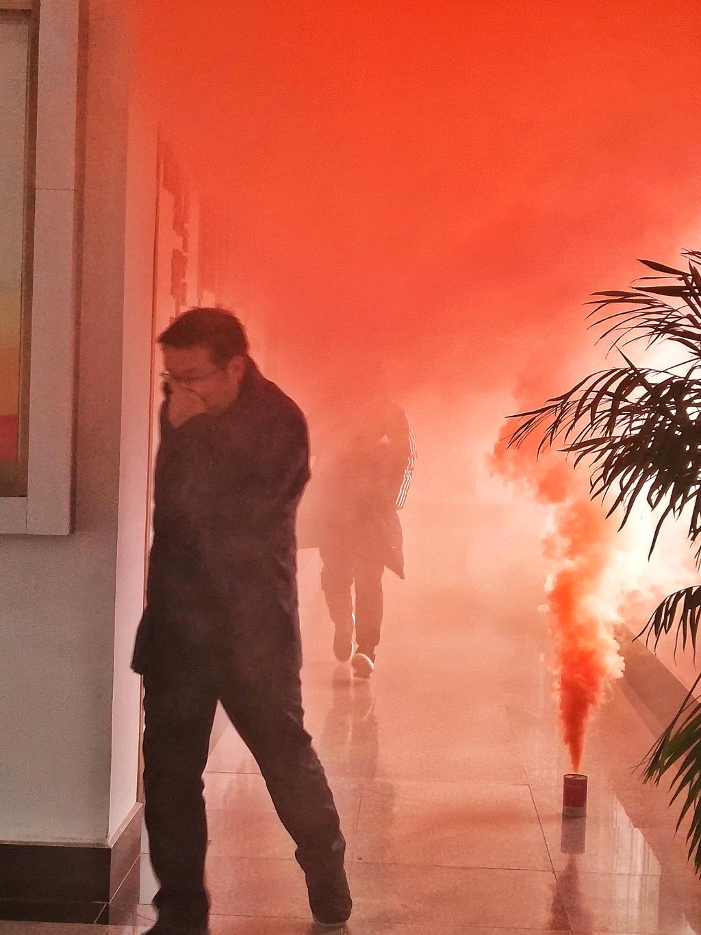 本次活动包括火灾模拟逃生演练、火灾逃生知识讲解、灭火器以及消防水带正确使用方法教学。现场模拟了学院办公室突发火灾的情景,在浓密的烟雾中全体师生听从现场领导指挥,相关负责人在各岗位疏散师生,在“掩住口鼻、弯腰前行、有序小跑”逃生技巧的引导下,从安全楼道迅速、有序、完整撤离火灾发生现场,到达开阔地带。