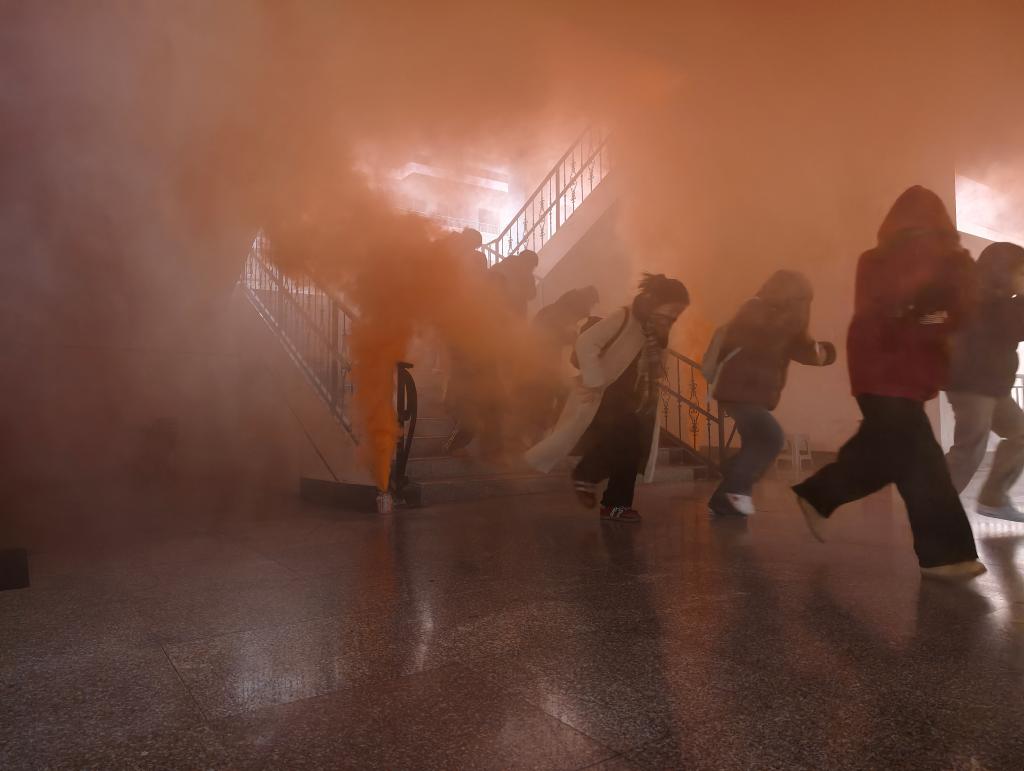 本次演练模拟真实火灾场景,设置烟雾环境还原突发火情。保卫处吕刚重点强调,火灾中90%的伤亡源于有毒烟雾,逃生时需优先选择无烟雾通道,沿墙面扶墙撤离,为救援人员留出通道;若通道被堵,应立即返回房间,用湿毛巾、牙膏等封堵门窗缝隙,清理阳台可燃物并朝门上泼水,延长救援等待时间。同时提醒,湿毛巾仅能短时间阻隔有毒气体,切勿盲目穿越浓烟火场。