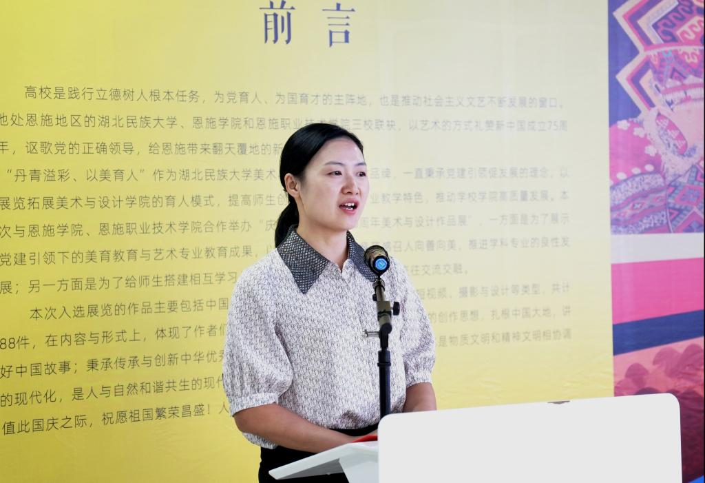 恩施州文联专职副主席张情讲话,她希望此次展览能够成为恩施州美术事业发展的又一个起点,也期待越来越多的青年美术家们扎根人民、融入生活,创作出更多更好的美术作品。