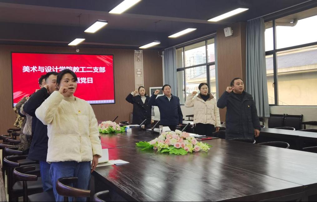 活动中,教工二支部书记向思全同志先后组织支部党员交纳党费、重温誓词、诵读党章。理论研学环节,由向思全、田英、王海军同志结合工作实际对理论文件进行领学。在政治生日的特色实践中,杨梓秦和胡明玥老师就入党以来的工作体会进行了分享。随后,杨梓秦、蒋孟、张建萍三位同志围绕“提升设计专业本硕人才培养质量”主题,从本科人才培养方案修订、人才培养质量提升、环境设计专业改造、学生创新创业和学科竞赛等方面进行了交流。