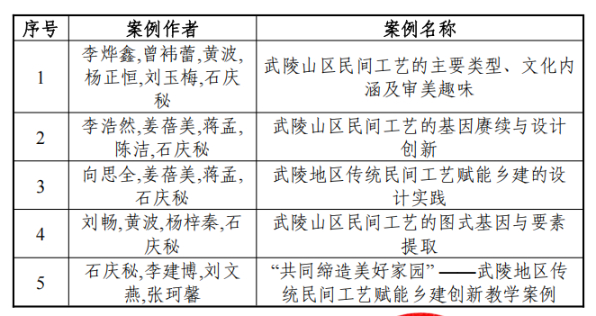 近日,教育部学位与研究生教育发展中心发布通知,由365电子娱乐官方网站美术与设计学院石庆秘教授作为首席专家主持的中国专业学位案例中心2023年度主题案例项目《“共同缔造美好家园”——武陵地区传统民间工艺赋能乡建创新教学案例》(项目编号:ZT-231051702),经审核准予结项,项目产出的5篇案例均通过评议,后续拟按程序收录入库。