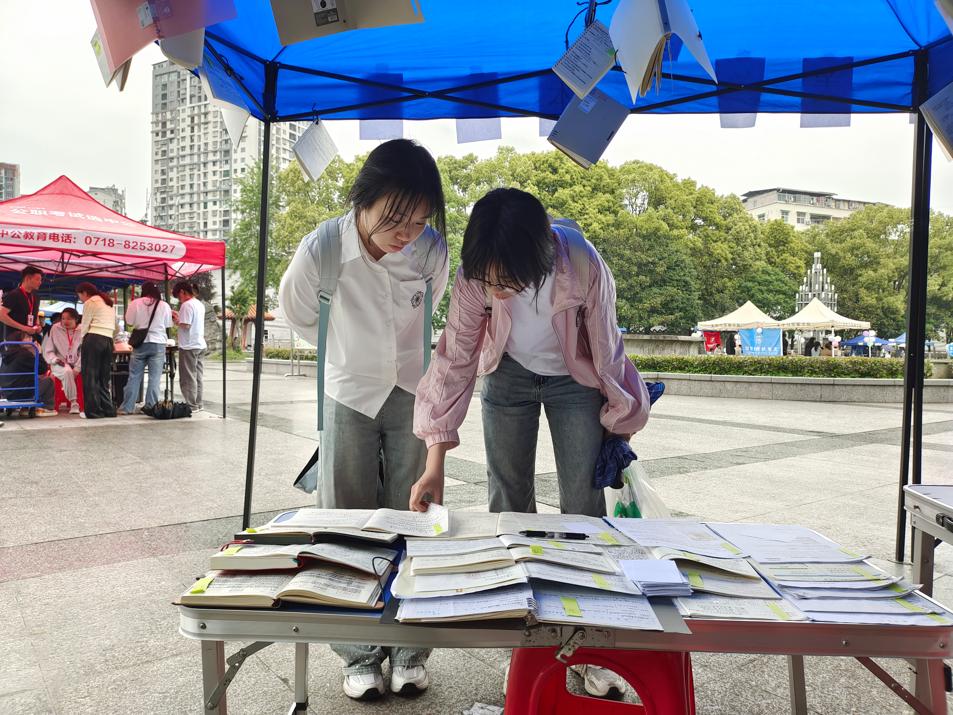 学生翻看展出作品