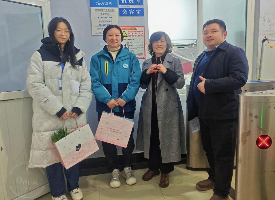 三月芳菲,情暖校园。3月8日下午,为庆祝第116个“三八”国际妇女节,数学与统计学院开展妇女节慰问活动,向长期坚守在学生公寓岗位的宿管阿姨们致以诚挚的节日问候。数学与统计学院党总支副书记郑敏、团委书记王宁奎、学生科副科长廖祥宇带领学生志愿者,前往达人片区和博学片区学生宿舍楼,将祝福送到宿管阿姨身边。
