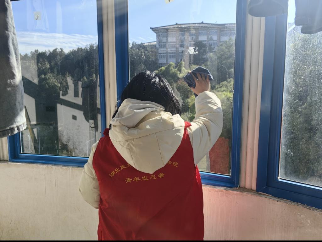 志愿者打扫寝室公共区域卫生