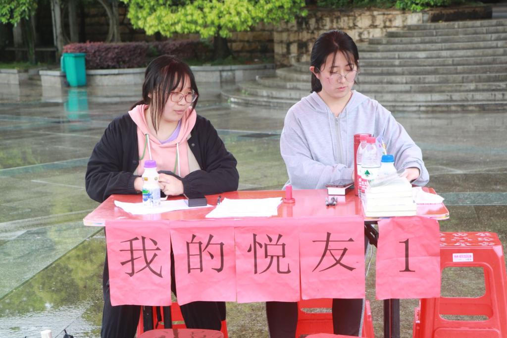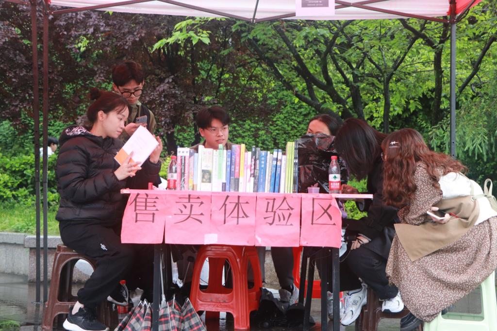 活动设有体验区,游戏区,交流区和销售区,四区围绕大学生广场圆形舞池搭建。其中,体验区的社交读书打卡活动通过线上打卡的方式,鼓励同学将阅读感受附上读书日活动话题发布线上,推动了全民共享阅读的传播;在销售区,负责人向读者热情介绍本次活动流程,以读者兴趣为基础推荐世界读书日精品书籍,吸引同学前来驻足,三百余本预订书籍不断向现场输送。雨下不停,活动现场读书氛围却持续升温。