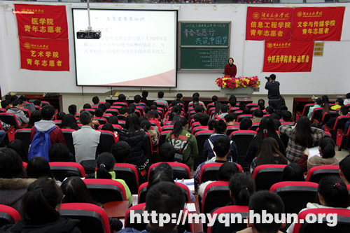 本网讯(通讯员 董贤婕 张红珠)11月25日,为明确志愿者服务精神,提升我校大学生服务水平,由我校文学与传媒学院、信息与工程学院、医学院、艺术学院、中医药学院联合举办的2015级青年志愿者成立暨培训大会于5B404圆满举行。校团委副书记唐文靓担任主讲,约两百多名青年志愿者参加培训。