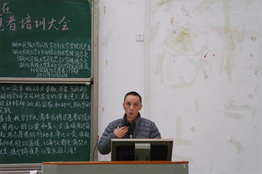 本网讯(记者 欧阳洁 刘雨/文 陈文宇 刘睿/图)为增强青年志愿者对志愿者服务活动意义的理解,加强各二级学院交流,10月22日,我院团总支社会实践与志愿者工作部联合生物科学与技术学院、马克思主义学院、美术与设计学院在修远楼5B404教室举办青年志愿者培训大会,恩施义工协会会长谭鸿担任主讲人,恩施州心理咨询师谭金钊、杨娟、张富琼受邀出席本次活动。各兄弟社团及四院大一年级青年志愿者参与聆听。