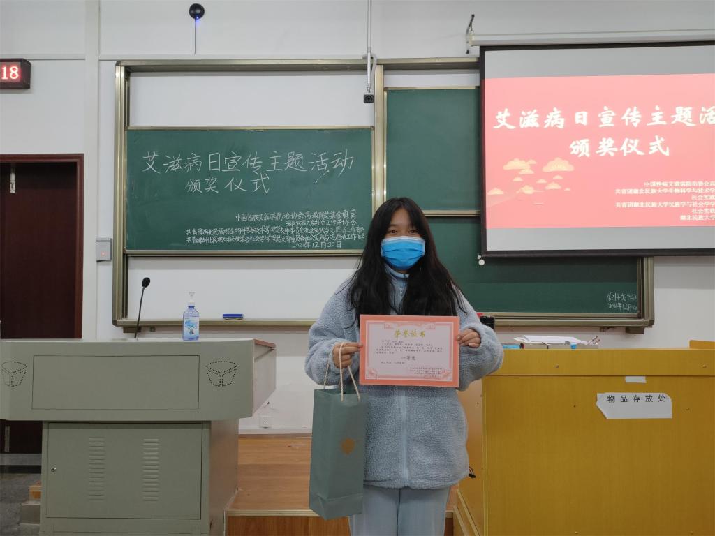颁奖仪式在主持人的致辞声中拉开序幕。随后活动负责人对艾滋病日宣传活动短视频及艾滋病普及手册获奖选手颁发荣誉证书与礼品。在短视频大赛的颁奖环节中,“完美派对”、“超有‘艾’”团队荣获三等奖;”看见‘艾’”、“颜值爆表”团队荣获二等奖;“为‘艾’而行”团队荣获一等奖。随后的防疫宣传手册颁奖环节中,1621402支部的刘美琳、张沐婷,1219402支部的张璇夺得三等奖;1620402支部的肖胜萱、1621402支部的陈诺夺得二等奖;1621402支部的蒲泓宇夺得一等奖。