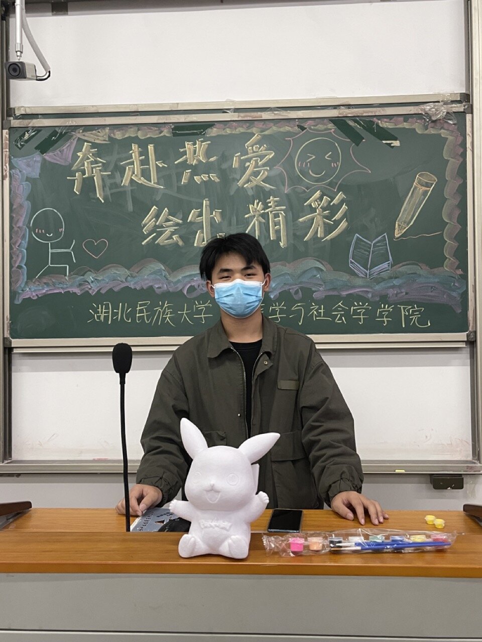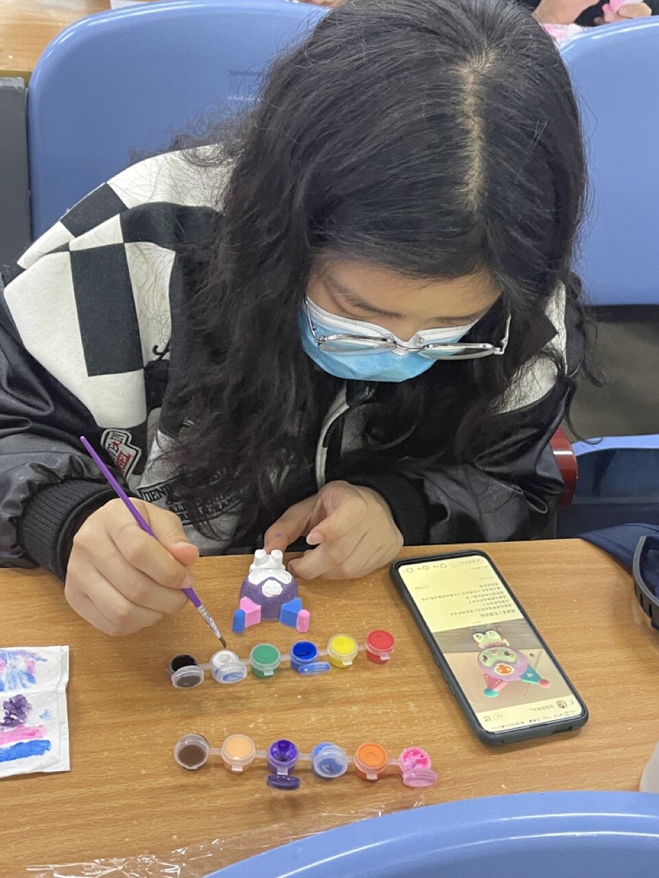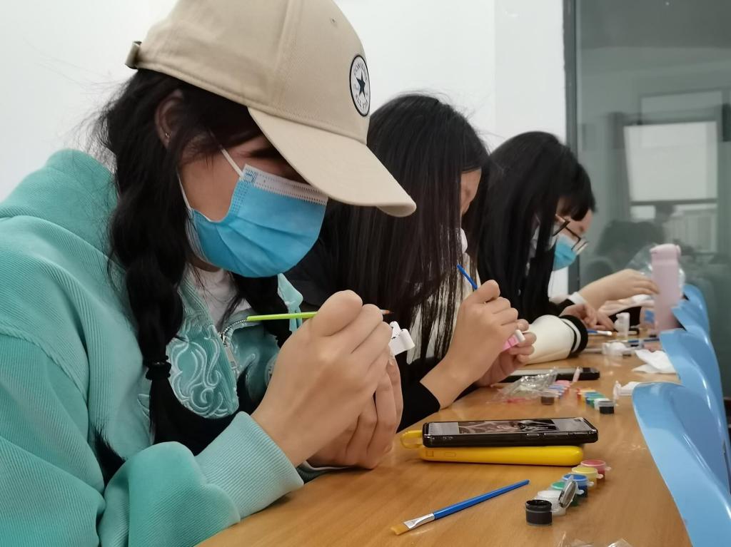 活动伊始,工作人员指引参加者进行签到,并从凯蒂猫娃娃、玲娜贝尔、史迪仔和库洛米娃娃等多种多样的石膏模型中挑选心仪的类型。随后,大一大二的学生在501教室涂鸦,大三则在506教室进行绘制,参加者有序落座,正式开始绘制:有的发挥想象力,挥笔泼墨;有的在网上搜索视频,开发新鲜创意;有的娓娓而谈,认真探讨描绘风格。在绘制期间,参与者有条不紊地选择图案、搭配颜色、塑造模型,促使石膏模型焕发多元化风姿。