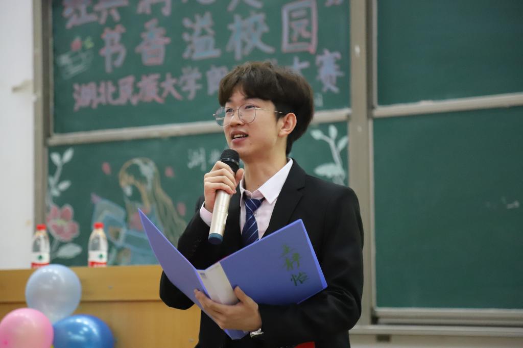比赛在主持人的致辞中拉开帷幕,共有八位选手晋级决赛,其中包含《采蒲台的苇》、《平凡的世界》、《青春中国》、《少年中国说》等八部作品。来自教师教育学院的三号选手梁桂菊,朗诵《青春中国》时,音韵抑扬顿挫,极富表现力与感染力;来自我院的二号选手董金科朗诵《平凡的世界》时声情并茂,如高山流水般让人印象深刻,同时结合自身经历,字字珠玑,并赢得在场听众的热烈掌声,最终以95分的优异成绩获得本次大赛桂冠。