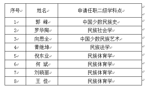 民族学一级学科2020年硕士研究生导师的初审工作已结束,经民族学一级学科学位评定委员会投票表决,共有8人通过硕士研究生指导教师资格的初审。现对初审合格名单进行公示,公示期为2020年6月19日至6月21日,在公示期内如有异议,请向民族学与社会学学院学科建设科反映,电话:13597768845、13217283481。电子邮箱:61904883@qq.com。