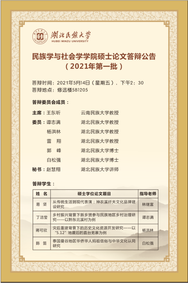 民族学与社会学学院硕士论文答辩公告(2021年第一批)