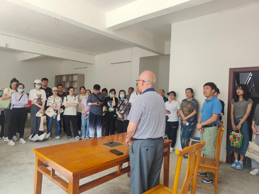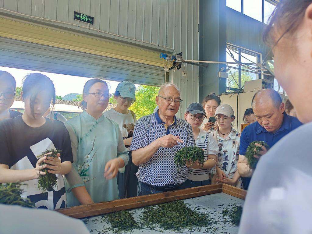 活动伊始,研究生工作站指导老师张连海引领我院研究生对茶厂相关制茶设备与制茶工艺进行了初步了解,并指导我院研究生开展了简单的藤茶处理工作。在前期介绍与准备工作完成后,国家级非遗传承人、恩施玉露制作大师杨胜伟老先生莅临现场,对恩施玉露的历史文化进行了讲解。他指出,恩施玉露经历了342年的发展与传承,历史悠久,文化底蕴丰厚,是恩施地区极具代表性的产品。同时,他表明,制作恩施玉露需经过九道工序,每一道工序都必须精益求精。不仅如此,杨老先生还现场展示了恩施玉露制作过程,亲自指导我院师生参与体验“揉茶”。