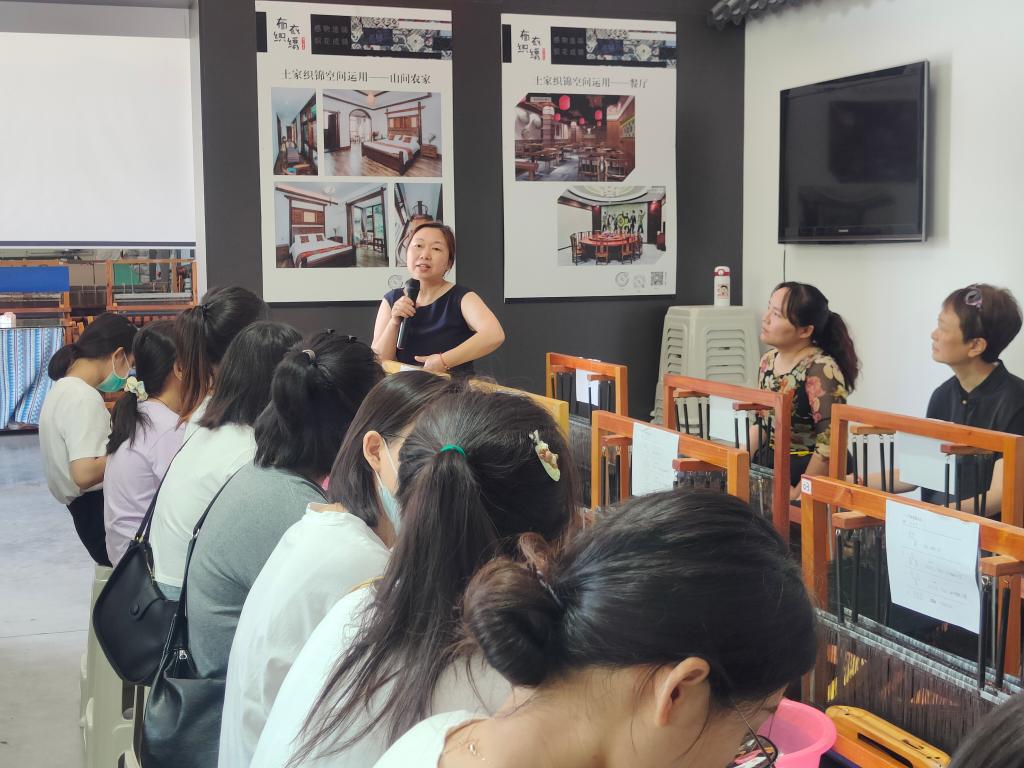 活动伊始,园区创始人田若兰女士通过播放视频,向大家简要介绍了“西兰卡普”。在土家语里,“西兰”是铺盖的意思,“卡普”是花的意思,“西兰卡普”即土家族人的花铺盖。同时视频中也向大家讲述了“西兰卡普”的历史文化,展示了部分传统图案和经过创新后的现代图案。紧接着,田女士向大家说明了织机的使用方法。随后,在园区多位老师的指导下,学生们开始制作“西兰卡普”作品。
