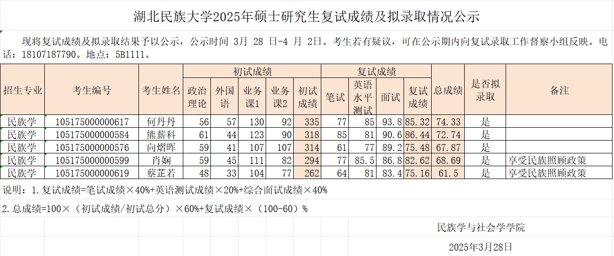 365电子娱乐官方网站民族学与社会学学院2025年硕士研究生第一志愿考生成绩及拟录取情况公示