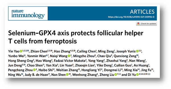 本网讯 多年联合攻关,硒元素研究取得重大进展。8月20日,民大医院“硒-免疫平衡与健康”研究团队的最新学术成果“Selenium-GPX4 axis protects follicular helper T cells from ferroptosis”(硒-硒蛋白GPX4功能轴保护滤泡辅助性 T细胞免于铁死亡)在国际顶级免疫学期刊Nature Immunology(自然杂志子刊,影响因子:25.606)在线发表。该研究创新性阐明了硒蛋白GPX4特异性调控滤泡辅助性 T(TFH)细胞稳态的新机制,并首次证实补硒可通过上调T细胞内GPX4水平促进TFH细胞功能,显著提高健康人群接种疫苗后的抗体分泌水平。