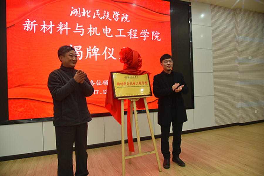 2017年12月15日,校长顿祖义(左)为新材料与机电工程学院揭牌