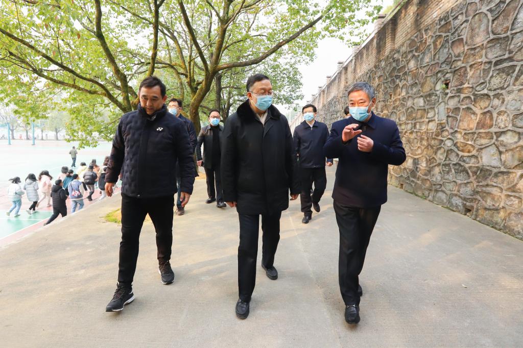 顿祖义(右一)向田学军(前排左二)汇报学校情况