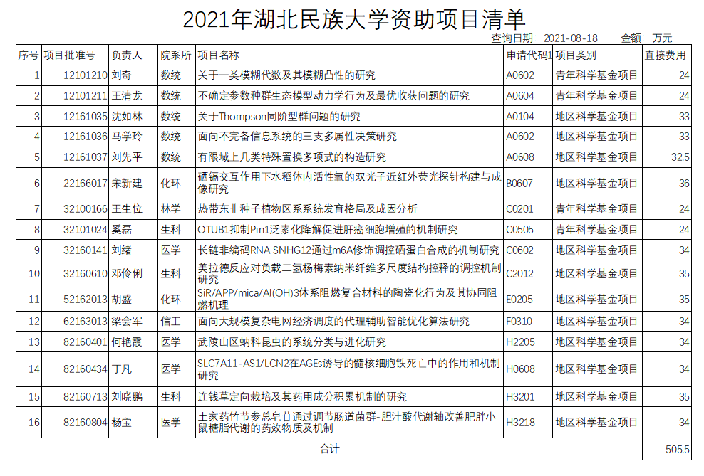 8月18日,国家自然科学基金委正式公布了2021年度国家自然科学基金申请项目评审结果,我校共有16项国家自然科学基金获得资助,其中地区基金12项,青年科学基金项目4项,获批直接经费共计505.5万元。
