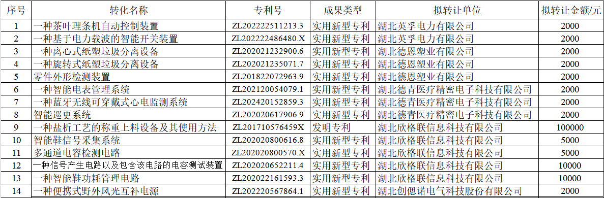 我校《一种茶叶理条机自动控制装置》(专利号:ZL202222511213.3)等14件授权发明专利拟转让,现予公示,公示期15个工作日。