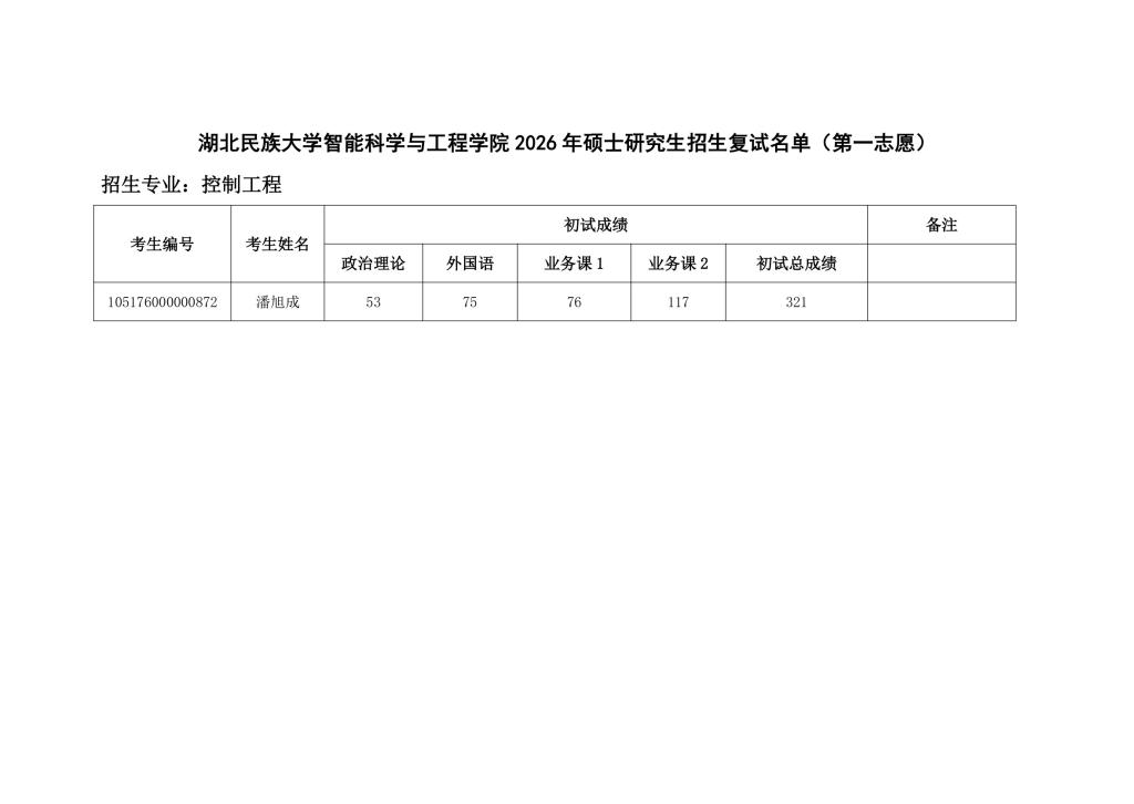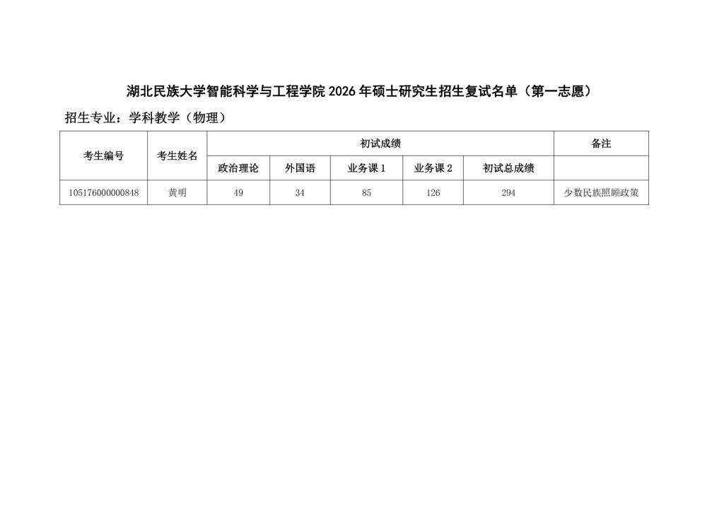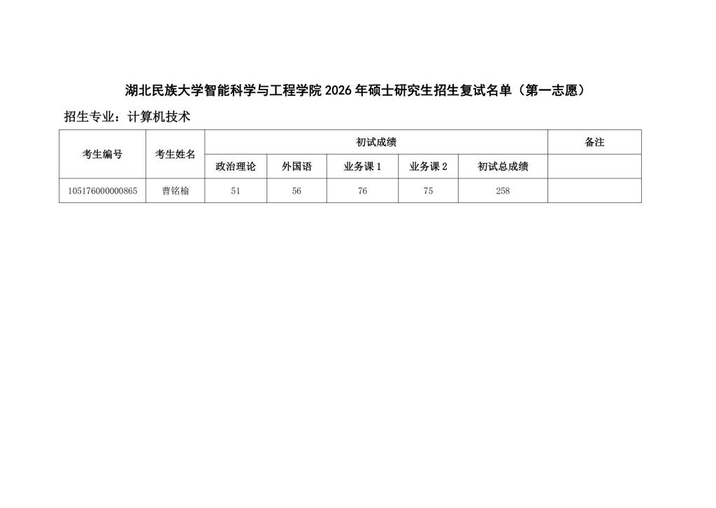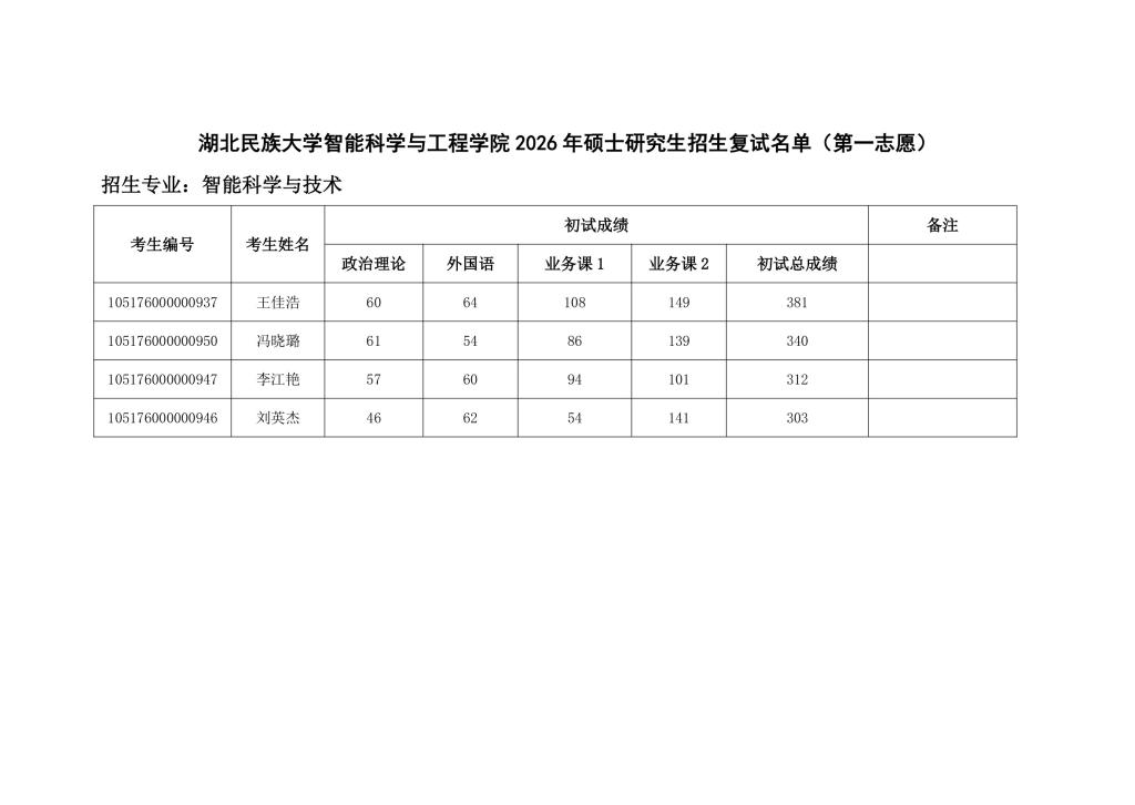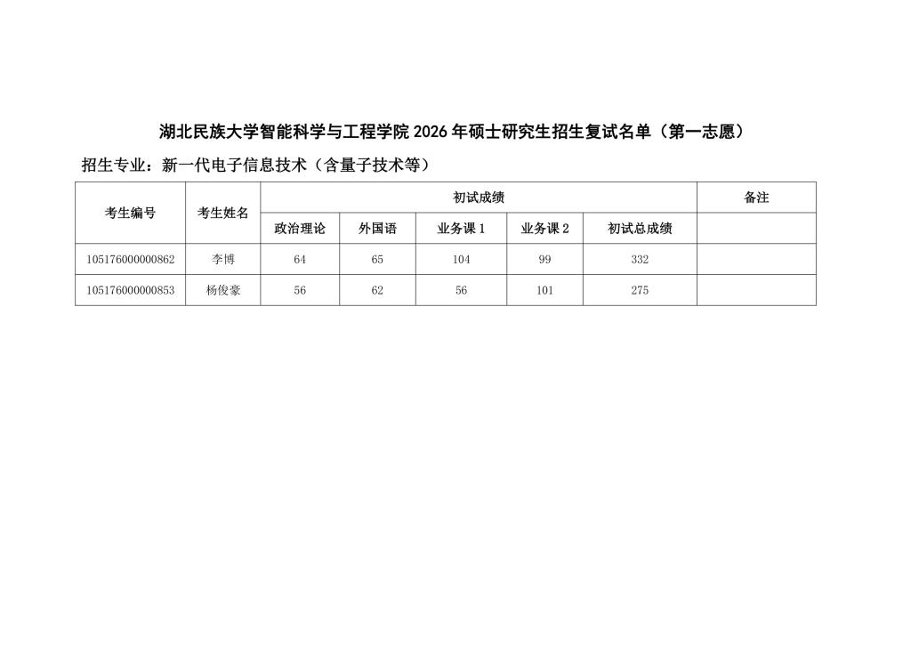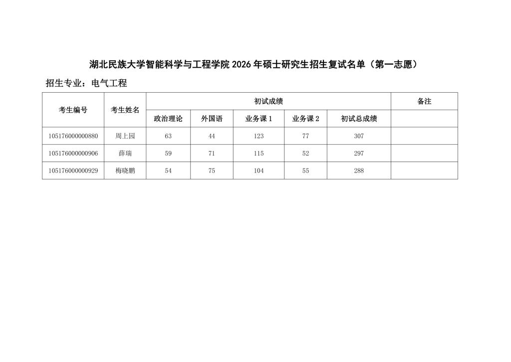 365电子娱乐官方网站智能科学与工程学院 2026 年硕士研究生招生复试名单(第一志愿)