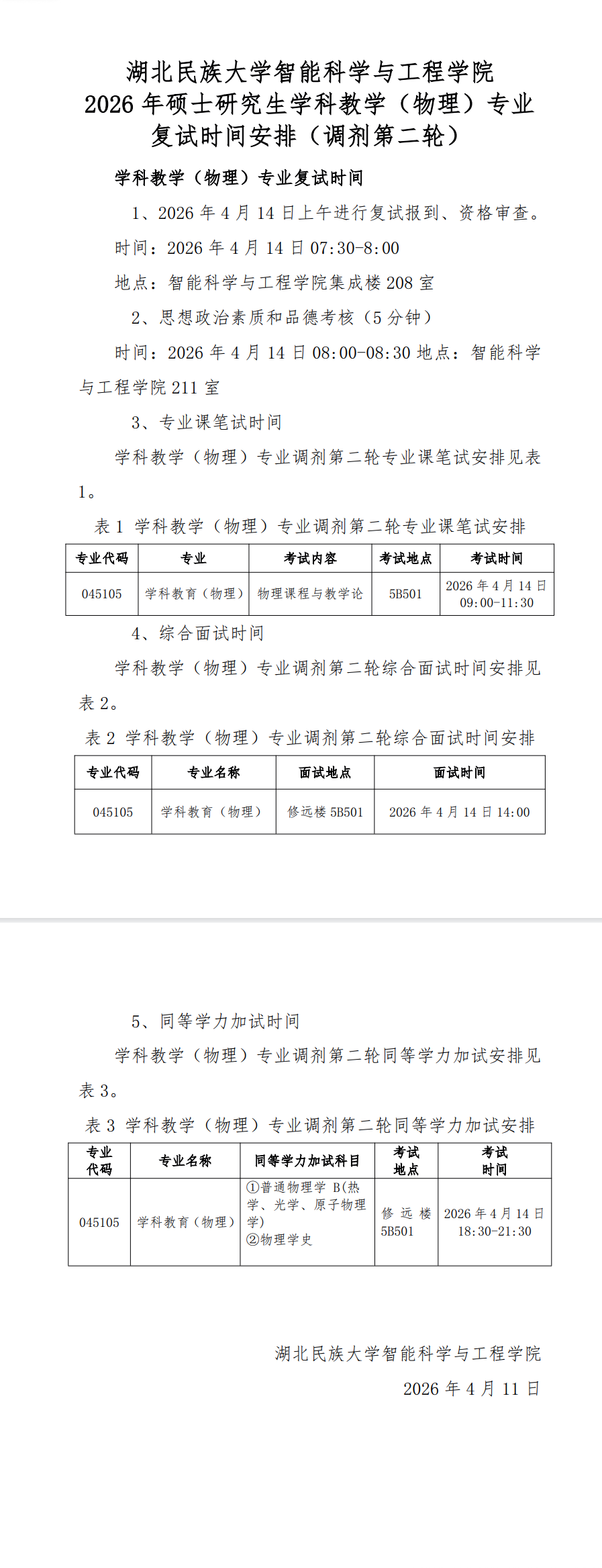 365电子娱乐官方网站智能科学与工程学院2026 年硕士研究生学科教学(物理)专业复试时间安排(调剂第二轮)