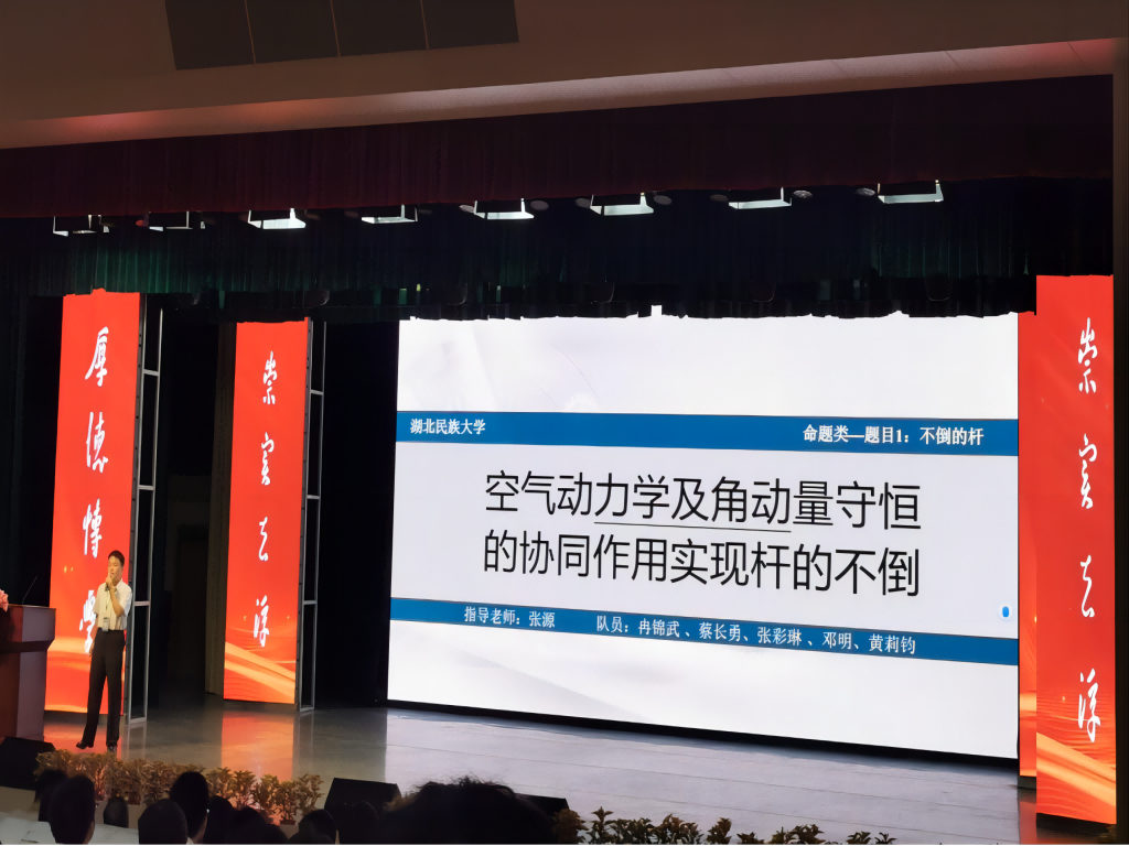 7月10日,第八届“飞梦达杯”湖北省大学生物理实验创新设计竞赛在武汉科技大学落幕。我校选拔了12支队伍参赛本次实验竞赛,最终获得一等奖2项,二等奖1项,三等奖6项。在大赛闭幕式上,我校选送的《空气动力学及角动量守恒的协同作用实现杆的不倒》作为一等奖优秀作品进行了现场展示。