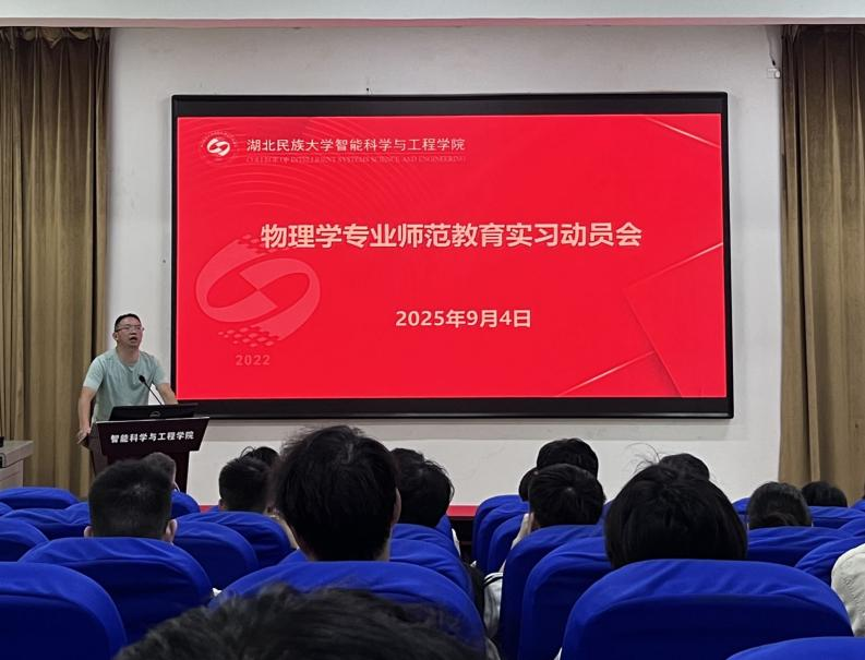 2025年9月4日,365电子娱乐官方网站智能科学与工程学院物理学专业召开师范教育实习动员大会。学院副院长向军教授、物理系主任刘显明教授、物理系书记蒋冰峰教授、教学办副科长王六顺老师,以及实习带教老师、班主任和2022级物理学专业全体学生参会。会议由刘显明主任主持。